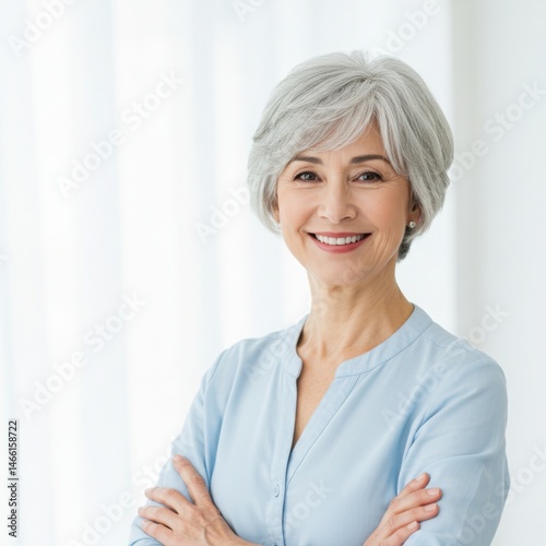 woman, portrait, mature, smile, face, beauty, elegant, grey, hair, senior, arm, crossed, shirt, blouse, light, skin, ageing, cheerful, confidence, positive, style, fashion, person, female, looking, posing, head shot, happy, adult, white, background