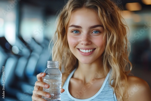 woman, gym, fitness, sport, water, bottle, drinking, healthy, lifestyle, wellness, exercise, training, physical exercise, hydratation, refreshment, health, beauty, smile, happy, fresh, active, blond, female, activewear, thirst, protein, recreation, leisure, indoor, equipment, treadmill, cardio, muscle, care, body, athletic, well-being, portrait, smiling, sportswoman, healthy lifestyle