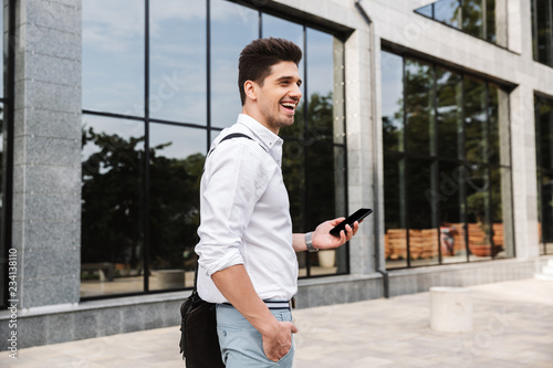 phone, adult, man, manager, business, shirt, businessman, success, person, typing, young, confidence, mobile, message, occupation, expertise, building, professional, men at work, collar, male, city, smart, 1, people, standing, elegance, fashion, office, white, only, communication, concept, leadership, urban, smartphone, bag, connection