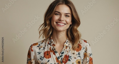 Smiling White female model in floral blouse on ivory background
