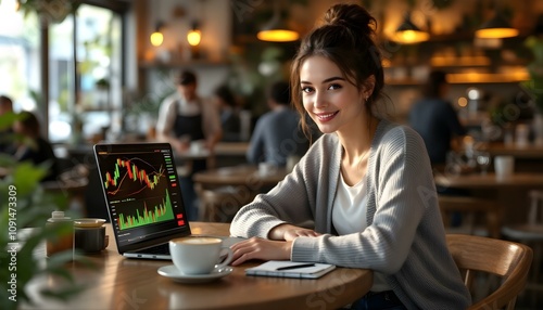 Smiling Woman Analyzing Stock Market Graphs on Laptop While Working in a Cozy Coffee Shop