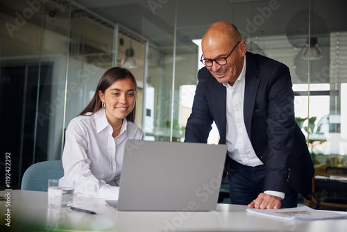 smiling, woman, businessman, using, laptop, office, technology, 2, people, computer, communication, senior, adult, online, business, man, casual attire, occupation, job, corporate, white, collar, men at work, service, connection, wireless, cyberspace, portability, portable, device, goggles, businesswoman, strategy, planning, young, pair, caucasian, lifestyle, co-worker, colleague, male, female