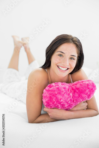 bedchamber, bed, lying, domestic life, comfortable, white, pink, relaxation, bedtime, home, house, smiling, happy, portrait, brown hair, beautiful, pretty, brunette, pillow, cheerful, cushion, resting, heart shape, love, holding, feeling, romance, romantic, leisure, lifestyle