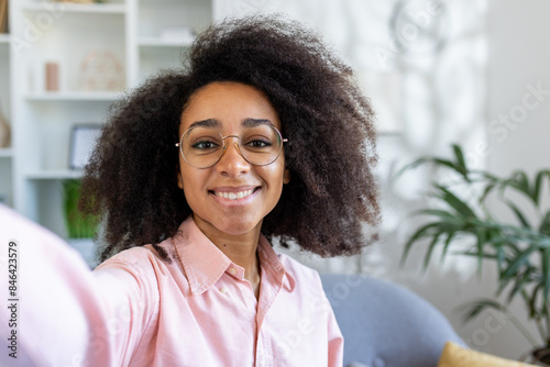 smile, smiling, female, woman, selfie, goggles, home, office, cosy, happy, portrait, casual attire, indoor, using, phone, look, camera, person, people, african american, black woman, hispanic, diverse, lifestyle, joyful, friendly, relaxed, modern, workspace, confidence, content, pleasant, comfortable, cheerful, afro, background, positive, wear, expression, attractive, youthful, ease, stylish, style, furniture, armchair, living room, interior, routine, enthusiastic