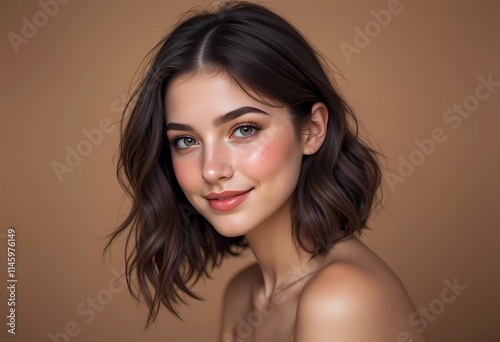 female, woman, beauty, portrait, smile, smiling, brown background, make-up, natural beauty, confidence, short hair, fashion, model, skincare, elegance, youthful, attractive, face, studio, posing, chic, photo, closeup, artistic, stylish, inspiration, profile, graceful, authentic, glamour, minimalistic, haircut, vibrant, happy, cheerful, lip, closeup, style, lady, care, 1, skin, person, eye