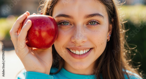woman, apple, face, smile, health, beauty, fruit, food, red, happy, young, natural, fresh, outdoors, portrait, healthy, skin, eye, teeth, diet, nourishment, wellness, organic, female, person, snack, vitality, vibrant, cheerful, red apple, missy, natural beauty, healthy lifestyle, fresh fruit, happy woman, sunny day, health food, healthy snack, farm fresh, holding