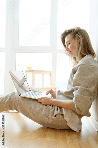 woman, mid-age, skinny, working, floor, laptop, pajama, grey, bright, daylight, window, cosy, workplace, home, office, barefoot beach, pretty, businesswoman, chatting, social network, web log, free, freelancer, morning, indoor, interior, modern, minimalistic, happiness
