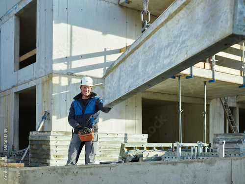 smiling, men at work, standing, near, construction, material, site, 1, people, industry, adult, man, outdoors, day, occupation, job, craftsman, craft, expertise, working, uniform, work, wear, hard, hat, helmet, assistance, architecture, exterior, sunlight, light, hanging, concrete, stonemason, austria, mature, caucasian, skill, building, male