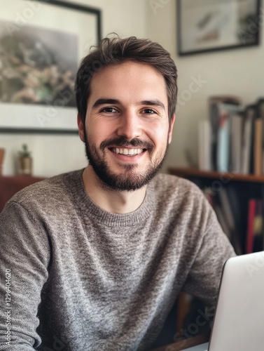 smiling, young adult, bearded, casual attire, man, sitting, student, freelancer, laptop, portrait, online, concept, happy, male, person, professional, indoor, workspace, modern, technology, room, stylish, confident, working, studying, education, smiling face, cheerful, casual attire, communication, digital, cyberspace, distance learning, self employed, creative, office, productive