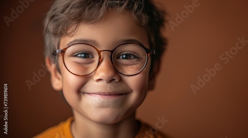 Smiling young boy with glasses, wearing orange shirt, against warm brown background.