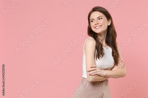 Smiling young brunette woman girl in light casual clothes posing isolated on pastel pink background studio portrait. People lifestyle concept. Mock up copy space. Holding hands crossed, looking aside.