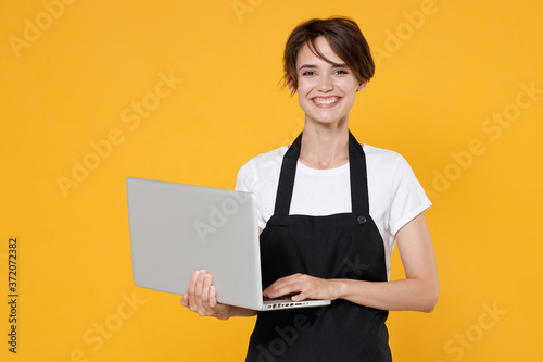 Smiling young female woman 20s barista bartender barman employee in white t-shirt apron posing working on laptop pc computer looking camera isolated on yellow color wall background studio portrait.