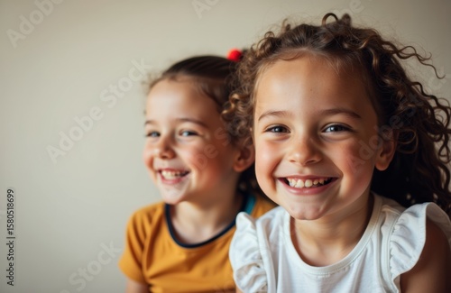 smile, girl, children, happy, friendship, curly, hair, joy, portrait, indoor, casual attire, fun, childhood, close, up, cheerful, positive, lifestyle, happiness, together, playful, youthful, innocence, bond, smiling, face, natural, light, relaxed, mood, family, sibling, portraiture, photo, emotional, connection, genuine, expression, concept