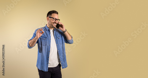 entrepreneur, man, ok, signs, mobile, phone, smiling, talking, discussing, call, mobile phone, beige, background, businessman, smartphone, listening, approve, young, gesture, smile, gesticulate, business, agree, recommend, freelance, shirt, happy, like, eyeglass, businessperson, communication, satisfied, photogenic, technology, choice, advice, occupation, studio, cheerful, pleased, conversation, wireless, standing, portable, device, work, copy space, person, male