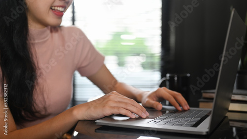Smiling young woman hands typing on laptop computer, working online from home. Cropped shot