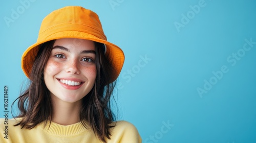 missy, smiling, blue background, vivid colors, joyful, youthful, trendy, happiness, friendly, relaxed, minimalist, orange color, playful, sunny, approachable, contemporary, warm tones, eye contact, fun, beauty, stylish, charming, personality, radiant, engaging