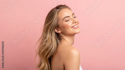 Smiling young woman with long blonde hair against pink background looking relaxed and happy