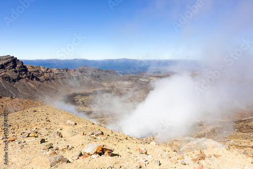 Smoke coming out of the ground at the Volcanic Plateau of Mt. Tongariro at Tongariro Alpine Crossing in New Zealand