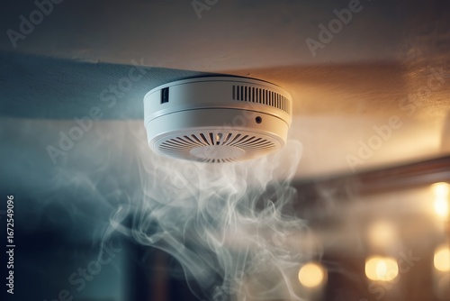 Smoke detector mounted on a ceiling with visible smoke nearby, concept of fire safety, early warning, and home or office protection.