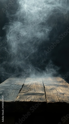 Smoke rising from a wooden surface in a dark setting evokes a mysterious atmosphere