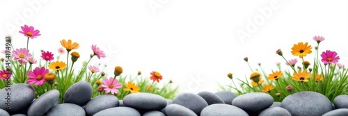 Smooth gray pebbles, vibrant wildflowers, white backdrop Tranquil scene , background, simple