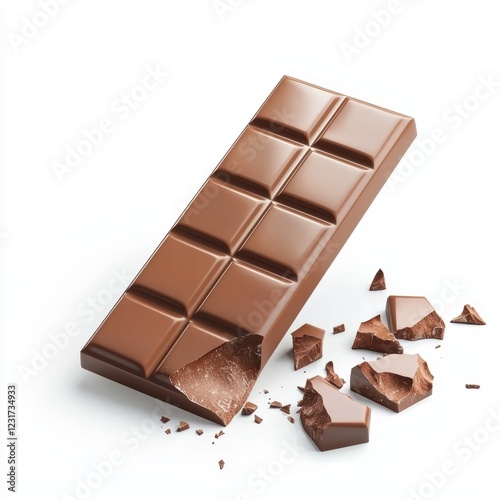 Smooth milk chocolate bar with a glossy surface and a few squares broken off, isolated on a clean white background