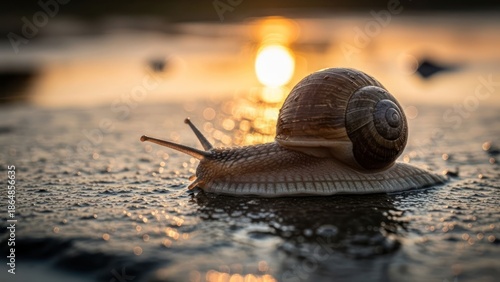 Snail crawling on wet sand with warm sunset glow and reflections