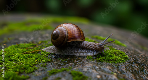 snail, moss, stone, nature, rain, wildlife, slow, creature, garden, macro, mollusc, shell, slime, tentacle, creeping, glistening, humid, ecology, environment, invertebrate, closeup, detail, forest, greenery, texture, damp, spring, summer, calm, zen, balance, earthy, organic, growth, miniature, timberland, exploration, microcosm, life, natural, ecosystem