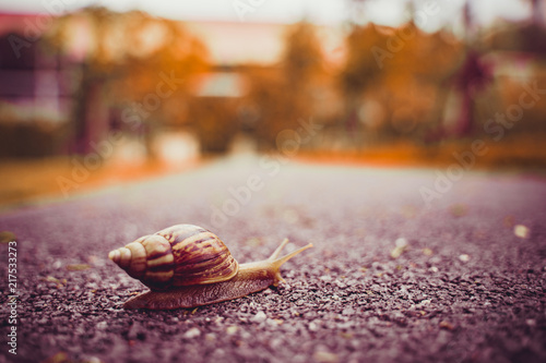 snail in shell crawling on road, summer day in garden with copy space, blurred background.