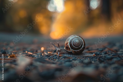 Snail moving slowly on gravel path in golden hour light.