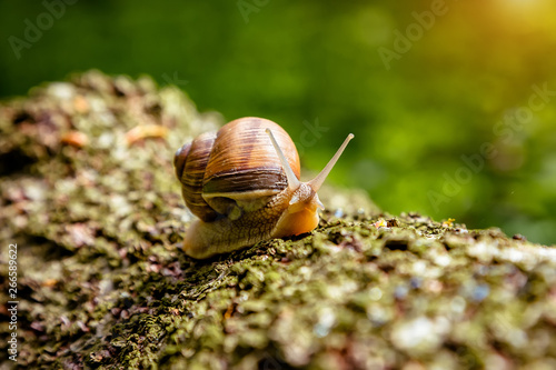 Snail on a tree in a summer park outdoors
