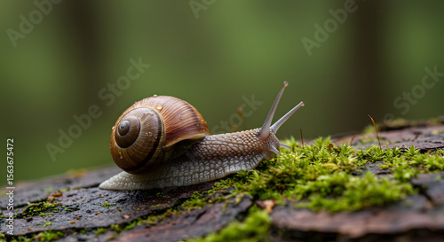 snail, mollusc, gastropod, nature, wildlife, animal, invertebrate, shell, slow, creeping, moss, forest, wood, green, brown, antennae, slime, trail, macro, closeup, damp, wet, garden, environment, ecology, biodiversity, detail, texture, spiral, curve, calm, peaceful, serene, quiet, tiny, small, wild, fauna, wilderness, exploration