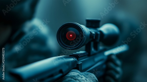 Sniper rifle scope with red reticle in focus during tactical operation in low light conditions