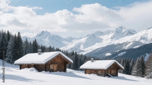 Snow - covered wooden cabins in the mountains, backed by towering snow - capped mountains and lush forests, presenting a quiet and pure winter natural scenery.