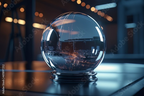 Snow globe with futuristic city architecture inside at the table made with generative Ai
