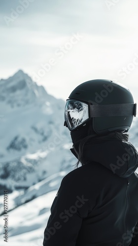 Snowboarder gazing at mountain peaks during winter in a snowy landscape