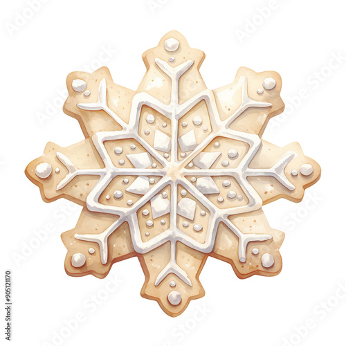 Snowflake shaped sugar cookie with white icing. Watercolor illustration isolated on transparent background. Christmas clipart for greeting card, sticker poster.