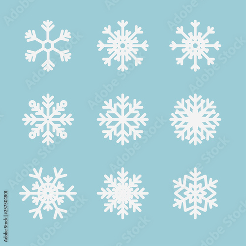 Snowflake winter set isolated on blue background. Flat snow icons, silhouette for Christmas banner, decor, cards. New year ornament, design.