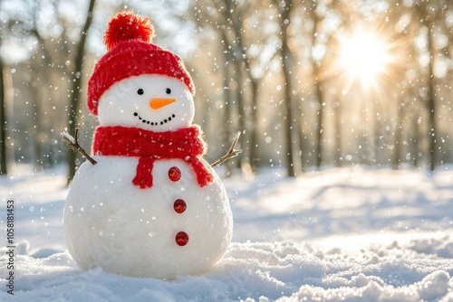 Snowman with a red hat and scarf in a snowy forest capturing the joyful festive spirit of winter with cheerful decorations and a warm holiday ambiance