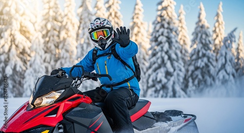 snowmobile, winter sports, adventure, extreme sport, rider, driver, person, helmet, goggles, waving, greeting, cold weather, winter, snow, forest, tree, powder snow, motorized, vehicle, action, speed, transportation, scenic, landscape, wilderness, frosty, sunlight, golden hour, backlit, travel, vacation, holiday, lifestyle, recreation, thrill, excitement, energy, journey, exploration, red, blue, white
