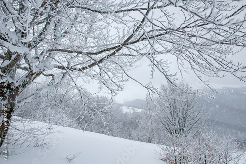 Snow-white trees in white hoarfrost. Winter landscape during a snow storm.