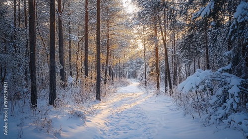Snowy Path Through a Winter Forest with Sunlight Streaming Through Trees