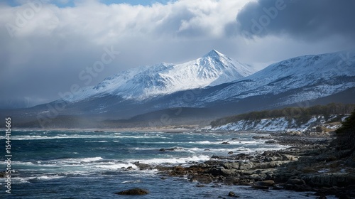 Snowy winter landscape of seno pia fjord and east arm in tierra del fuego, chile