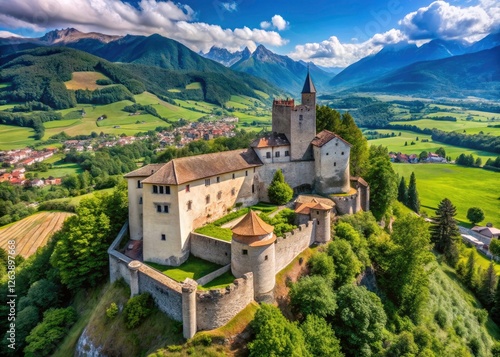Soaring above Presule Castle in South Tyrol, Italy: a breathtaking medieval aerial perspective.