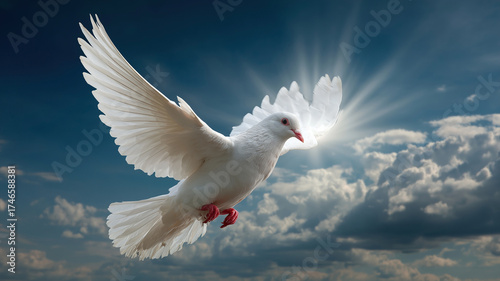 Soaring white dove signifies peace and spirituality in a bright sky filled with clouds