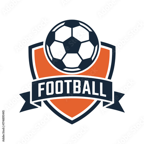Soccer ball emblem with football text and orange shield sport logo