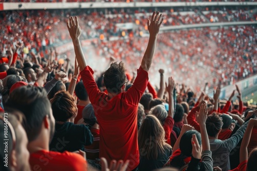celebrate, red, adult, cheering, stadium, soccer, fan, crowded, football, people, sport, music, photo, shirt, woman, hand, team, time, electronic, earphones, audience, clothing, happy, human, face, head, hat, atmosphere, festival, outdoors, apparel, athlete, evening, success, female, arena, blank, event, image, celebration, competition, performance, excitement, triumphant, enjoyment