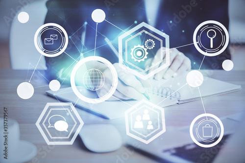 Social network theme hologram over woman's hands writing background. Concept of international people connect. Double exposure