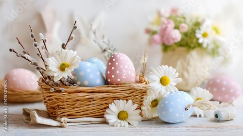 easter, egg, flower, floral, willow, basket, soft, pastel, spring, holiday, decoration, festive, celebration, still life, blurred background, gentle, light, home, background, delicate