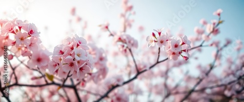Soft focus cherry blossoms gently fading into a pale blue sky, peaceful spring scene, soft, dreamy, illustration
